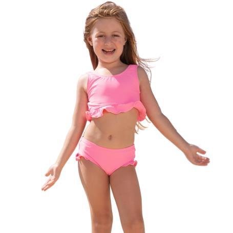 Biquíni infantil confeccionado em malha com alta elasticidade, toque suave e secagem rápida. O top possui alças fixas e aplicação de babado frontal, proporcionando charme ao visual. A calcinha acompanha babado na cintura, com modelagem confortável e forro interno para maior segurança durante o uso. Ideal para atividades aquáticas e exposição ao sol. Disponível em estampas exclusivas e cores vibrantes.