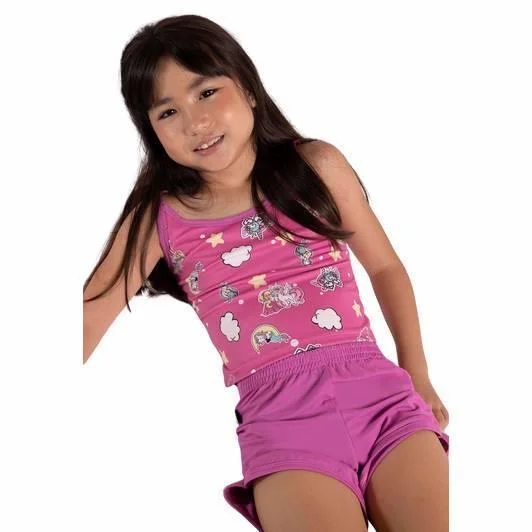 Confeccionado em tecido suede, que garante um toque suave e aconchegante, ideal para quem precisa de conforto durante o descanso, sem abrir mão do estilo.A blusa de alcinha, com sua estampa divertida e colorida, traz toda a alegria e energia, enquanto a bermuda lisa oferece um toque macio e confortável.